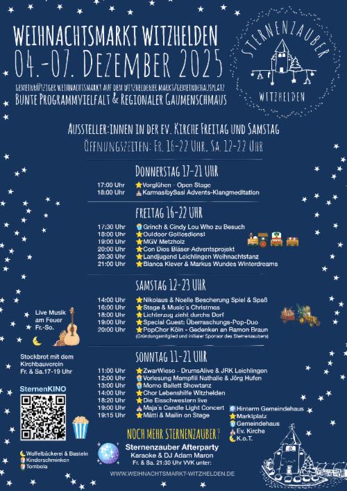 Der Kirchbauverein Witzhelden e. V. wird auch in diesem Jahr den Sternenzauber aktiv unterstützen. Wir werden von Freitag – Sonntag für den Sternenzauber wieder die Würstchen grillen, am Freitag und Samstag für die Kinder jeweils von 17.00 -19.00 Uhr Stockbrot anbieten und natürlich auch in der Kirche an einem eigenen Stand über unsere Arbeit informieren und neue Mitglieder werben.